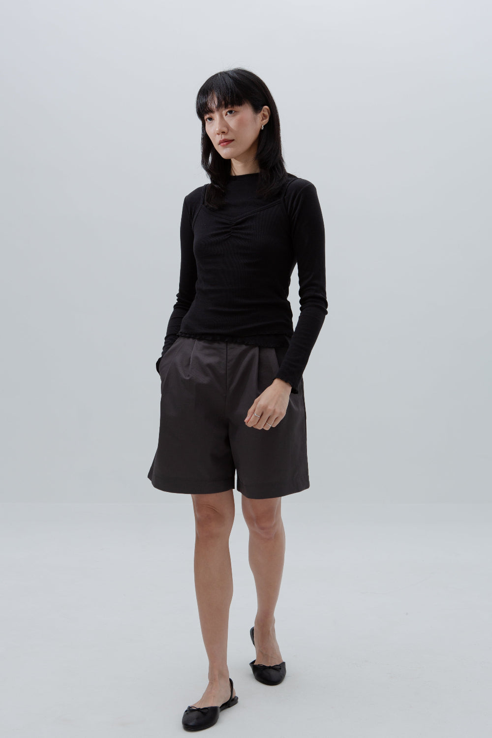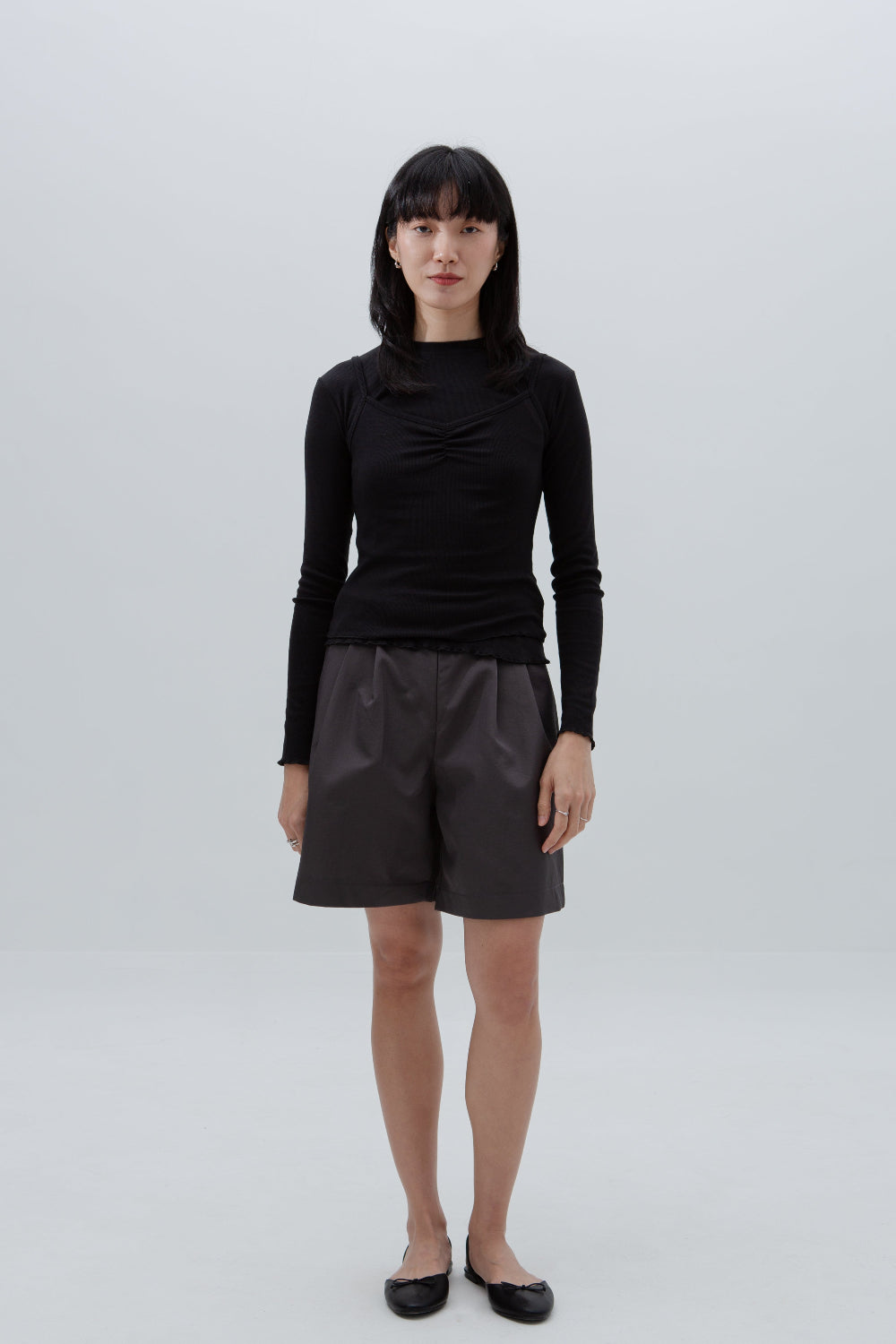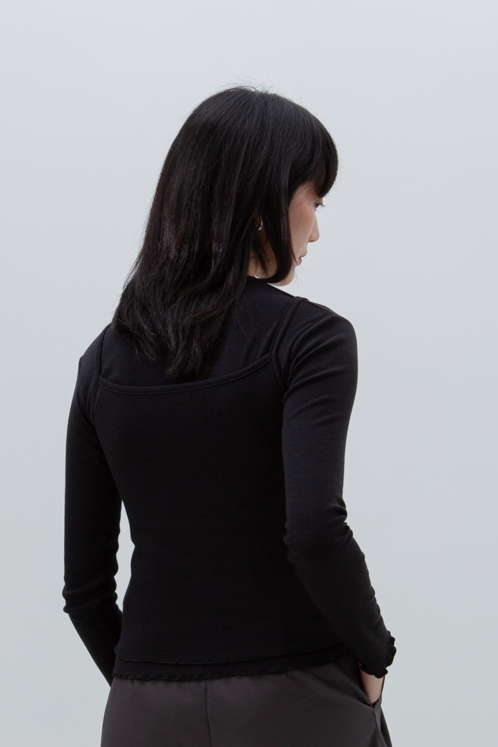 A two-set layer top. Made of ultra soft, lightweight and stretchable cotton modal, one  long sleeve top with one thin tank top, both in same colour and material for a coordinated layered summer look. Beautiful lettuce hem details adds a playful, textured edge.