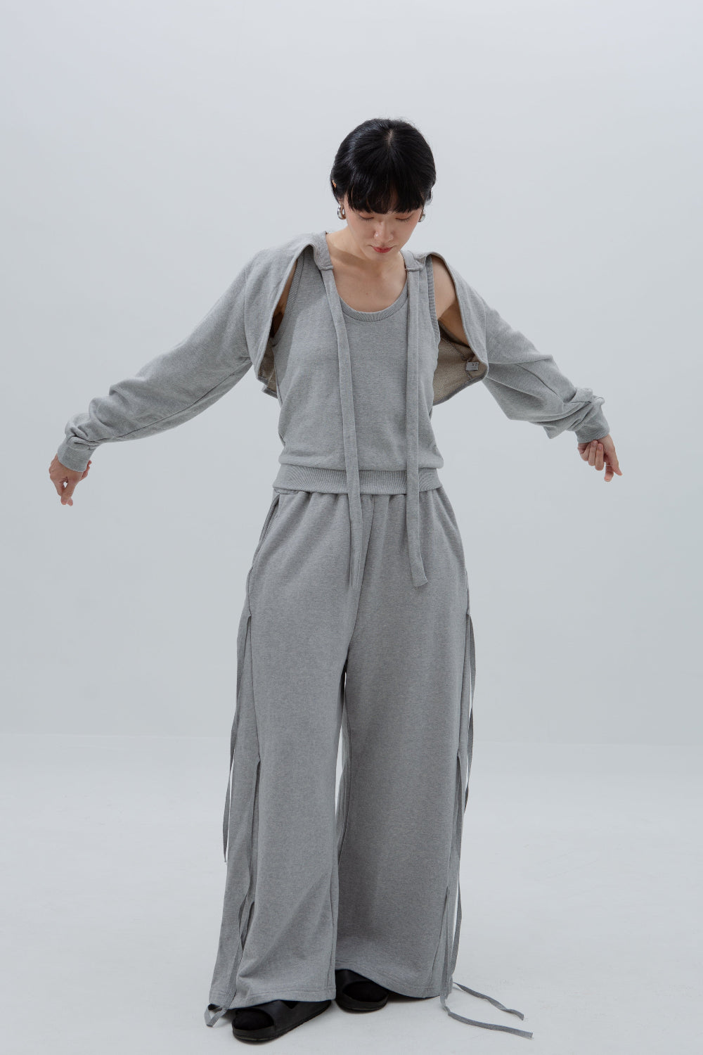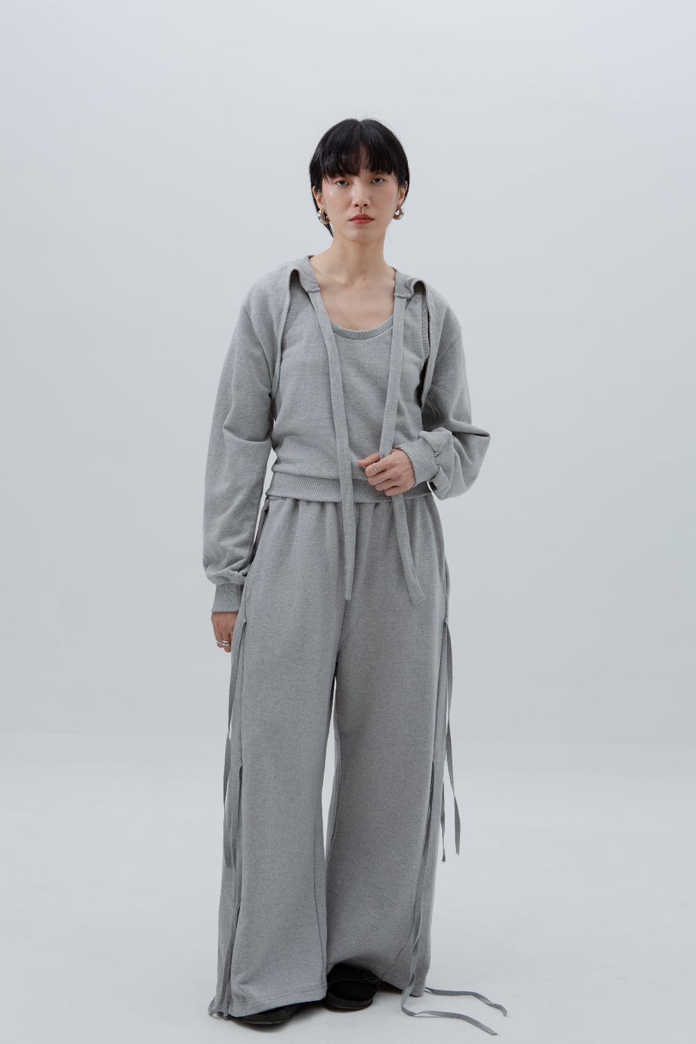 A two-piece set. Made of 100% Korean cotton, one sleeveless tank top in relaxed fit, and one long sleeve casual bolero shrug. Wear together for a coordinated casual look or use as separates.