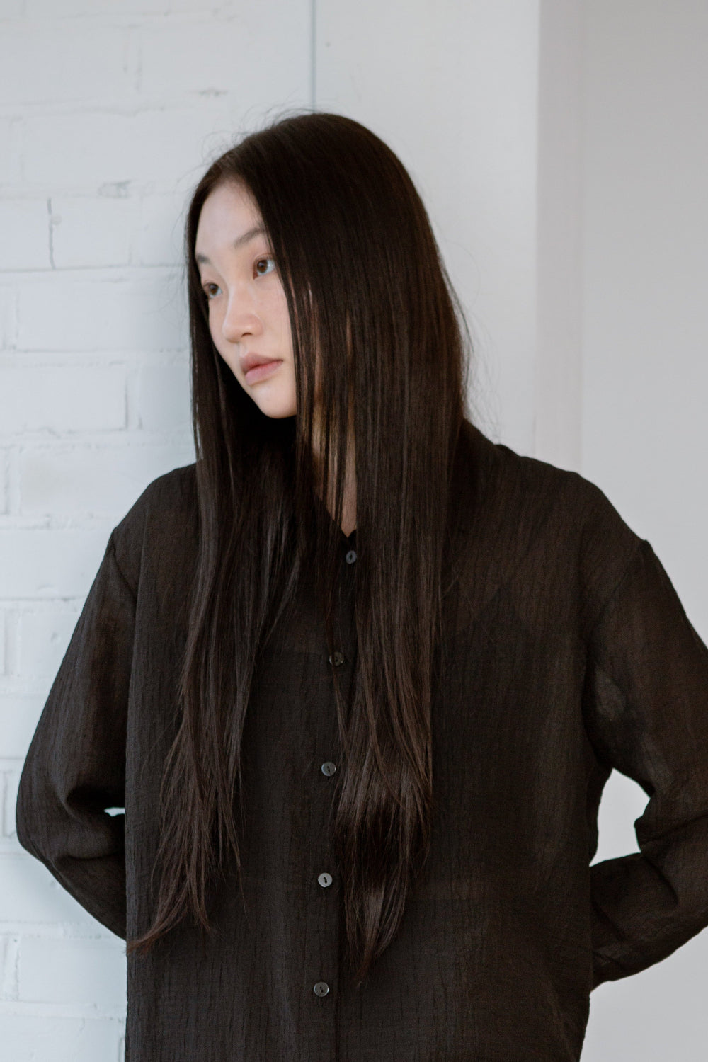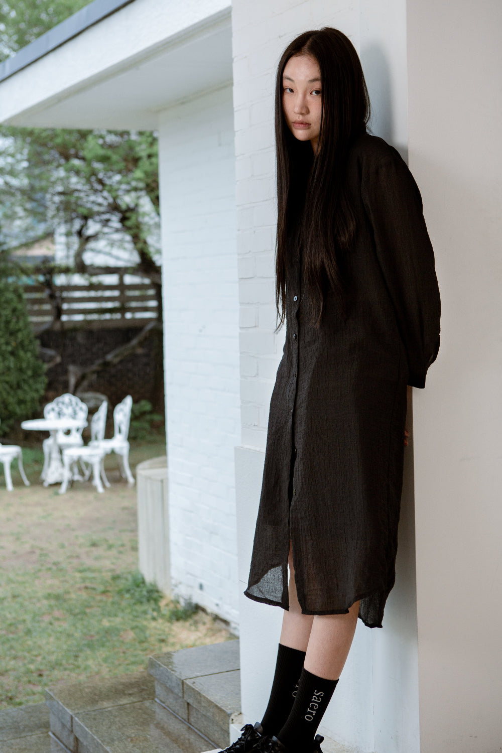 Made with the signature crinkly texture and thinner tencel fabric, a transulent long shirt version with multiple ways of wear designed for fashion aficionados. Long tops are a common style to match with pants, jeans and long skirts in South Korea.