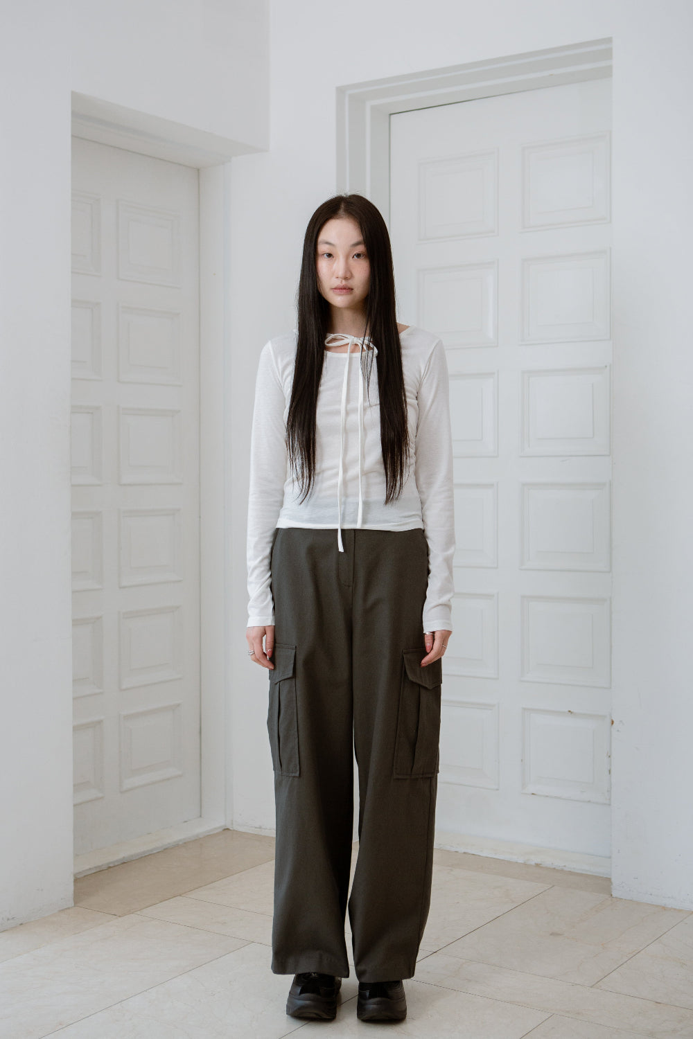 Tie string detail, to be tied either in front or at the back adds dimension, versatility and uniqueness to this wardrobe staple. Subtle ruche design at side for a more shapely silhouette.