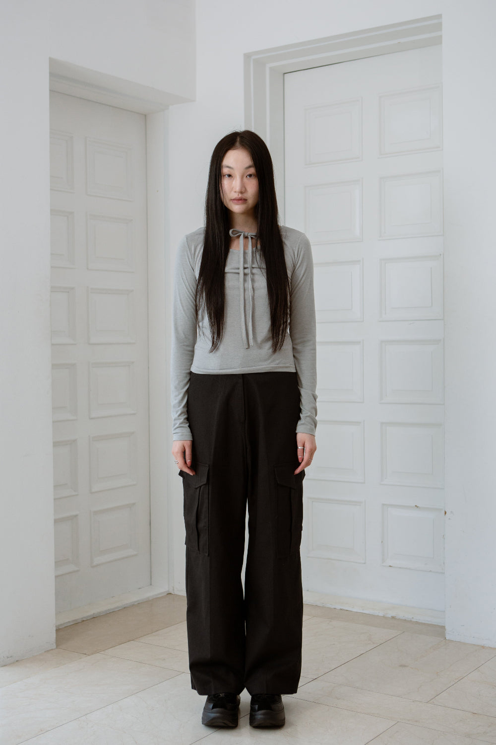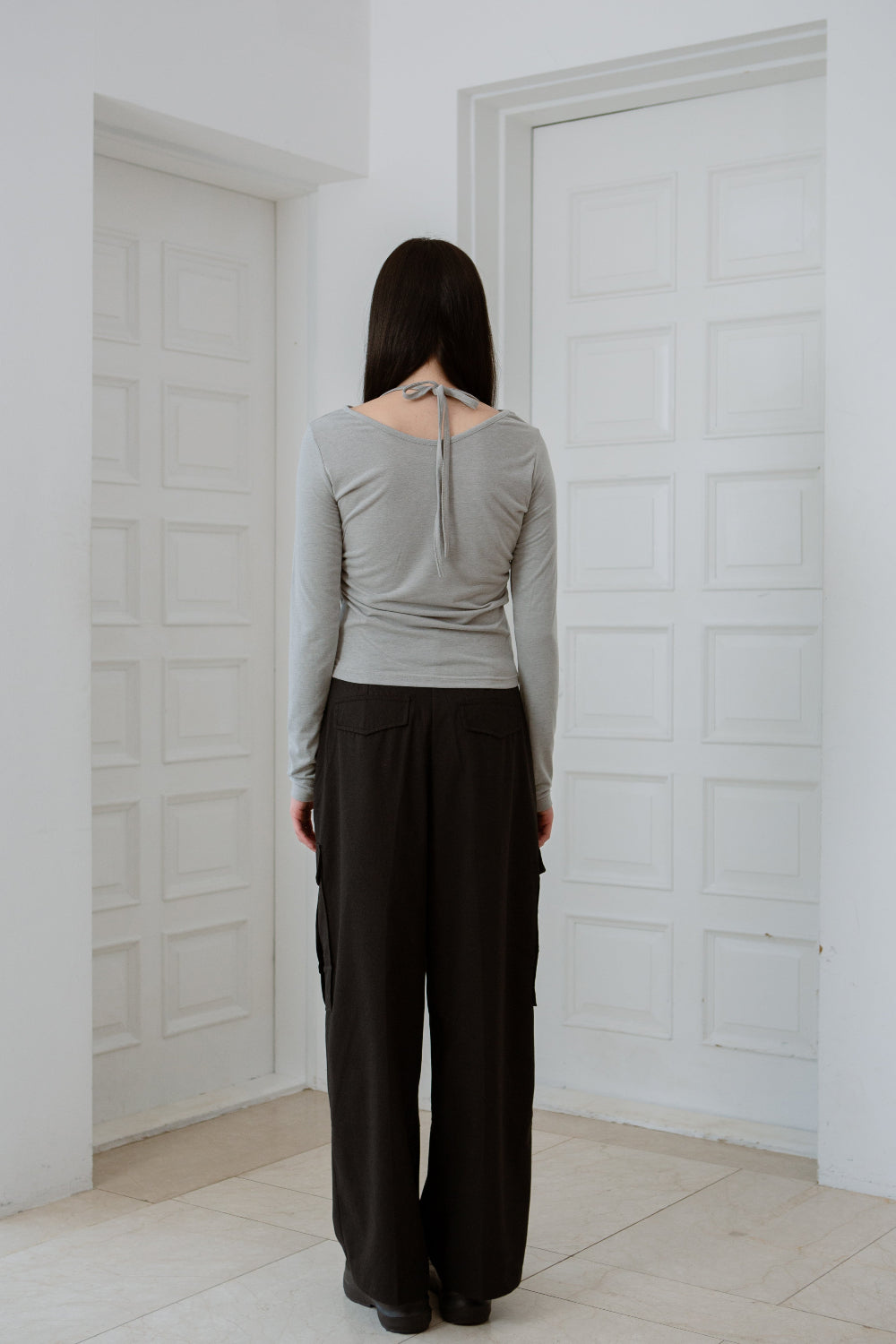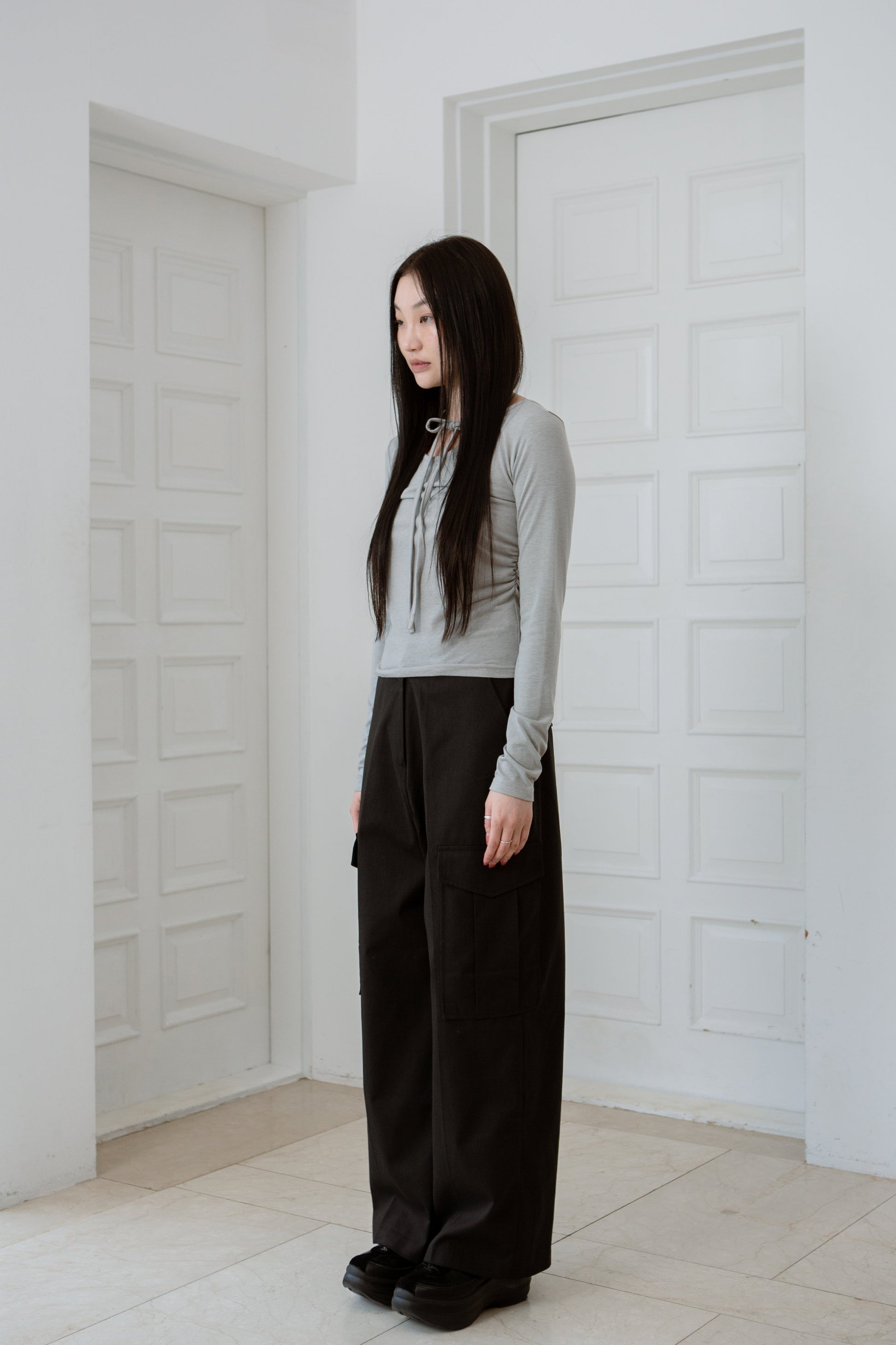 Tie string detail, to be tied either in front or at the back adds dimension, versatility and uniqueness to this wardrobe staple. Subtle ruche design at side for a more shapely silhouette.